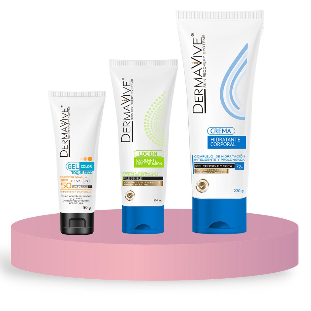 Contenido: Crema hidratante corporal Dermavive, Exfoliante facial Dermavive, Protector solar PFS50+ Dermavive toque color